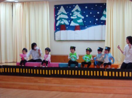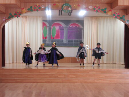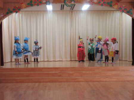 5歳児きりん組さんは、和太鼓・劇「くるみ割り人形」・合唱