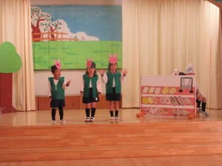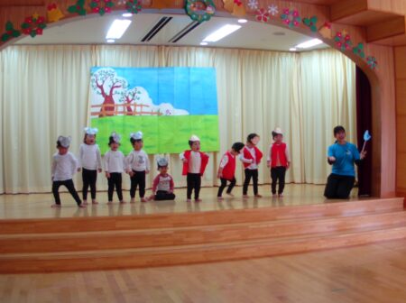 4歳児らいおん組さんは、絵本「白雪姫」の劇と、「てをつなご