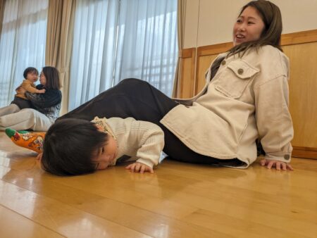 今日は、1歳児ぱんだ組さんの参加保育でした。大好きな