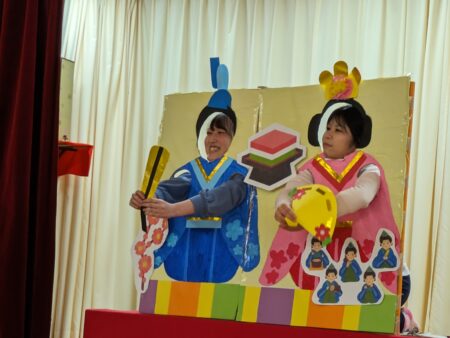 お次は、先生たちの出し物です✨顔出しパネルの、お雛様と