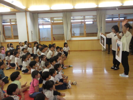 れてきたり.…」「山が崩れたり…」先生のお話をみんな真剣な表